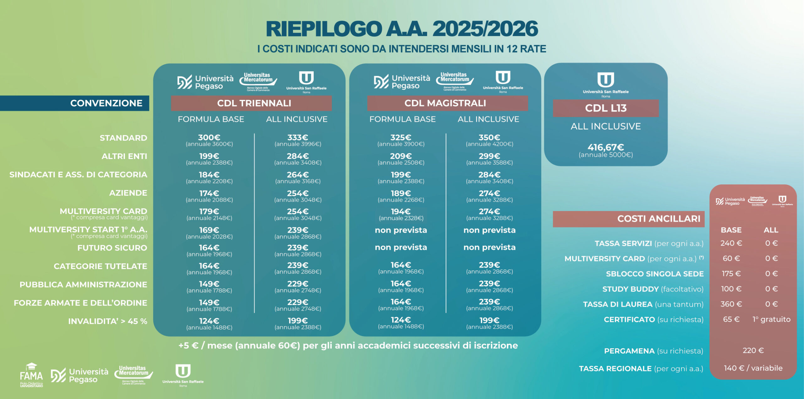 Il Polo Didattico FAMA è centro accreditato per l’orientamento e l’assistenza gratuita per gli iscritti dell’Università Pegaso , Università Mercatorum ed Università San Raffaele, permette a tutti gli iscritti con il nostro polo di orientamento universitario di usufruire di una retta agevolata a partire da 179€ /mese in formula standard e retta a partire da 254€/mese in formula all inclusive!
